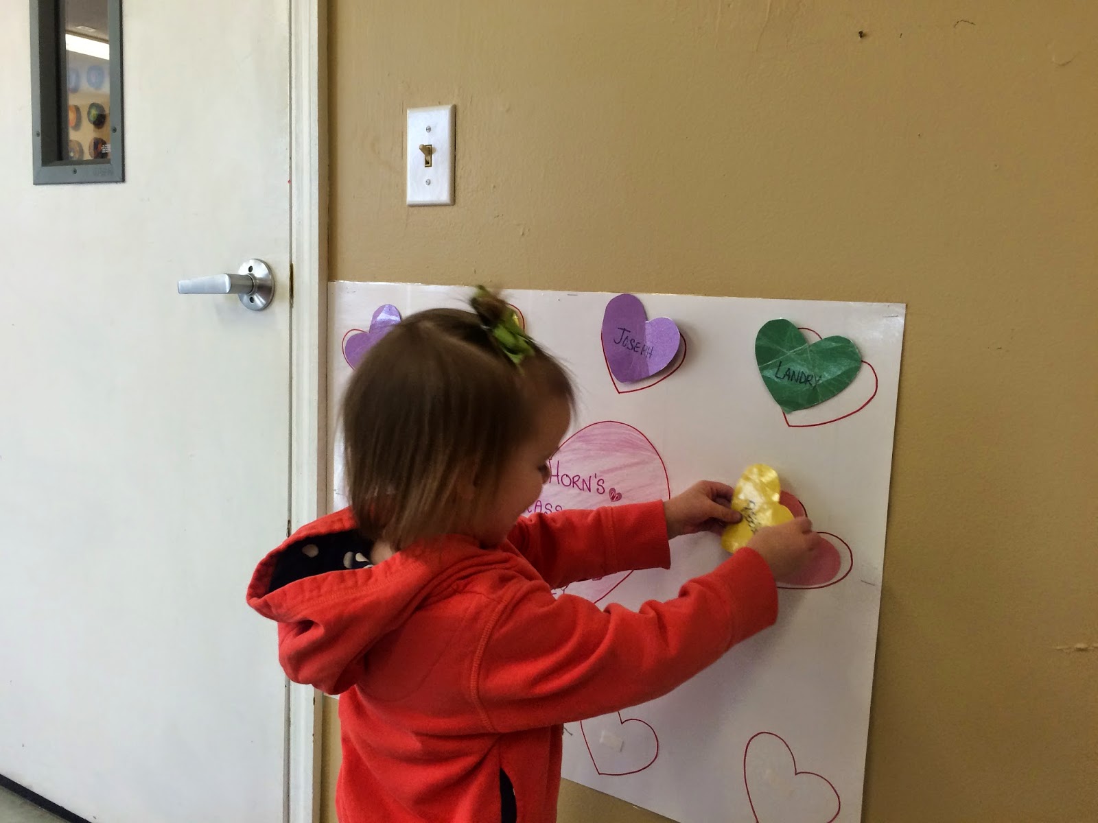 We practiced our throwing skills today as we tossed a bean bag in our heart cut out. After we tossed our bean bag we had to place our heart on our name board. This allowed us to incorporate some gross motor skills as well as work on letter and name recognition, our colors as well as following directions and using our listening ears.