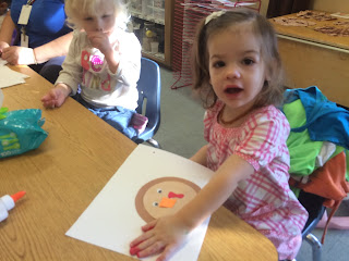 To start this center we had to glue our turkeys body a big brown circle and then his head a small light brown circle. This helped us review the shape of a circle and also the color brown, we also worked on the math concept of big and small. Next we had to make his face we used googly eyes that were great to work on our fine motor skills as they were not too big and were sticky, next we glued on an orange beak and lastly a red gobbler. We were able to work on face identification and review colors we have already had and counting to the number 2 as we counted 2 eyes. Next, we added four feather Red, Orange, Yellow and Green. We were able to work on sensory skills as we painted our hand to make the feathers. We also were able to work on color identification and counting to the number 4. These turkeys are some of the best turkeys in town be sure and check them out over the course of the week in our classroom!