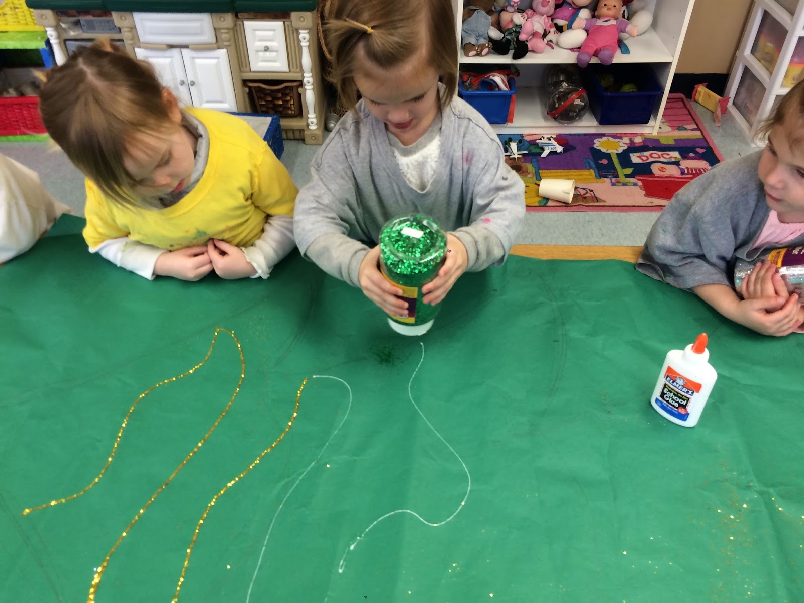 We started decorating a huge Christmas tree that we will be hanging up in our classroom this week. We painted ornaments yesterday and today we added some glitter for a little bit of sparkle and lights for our tree!